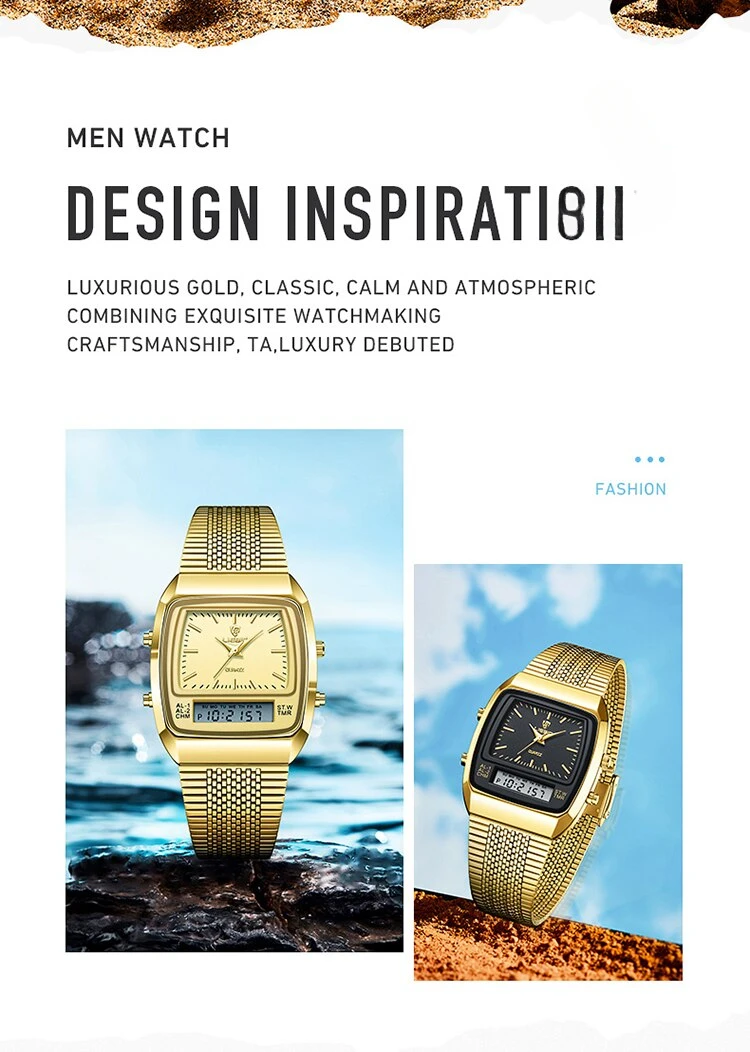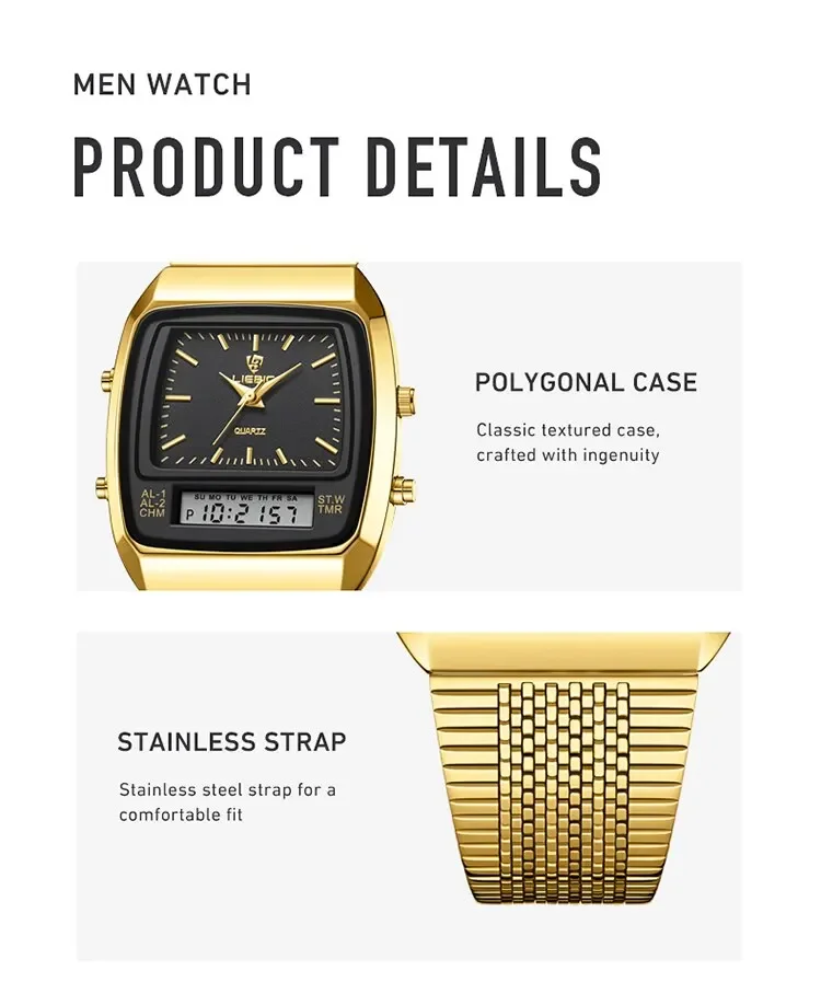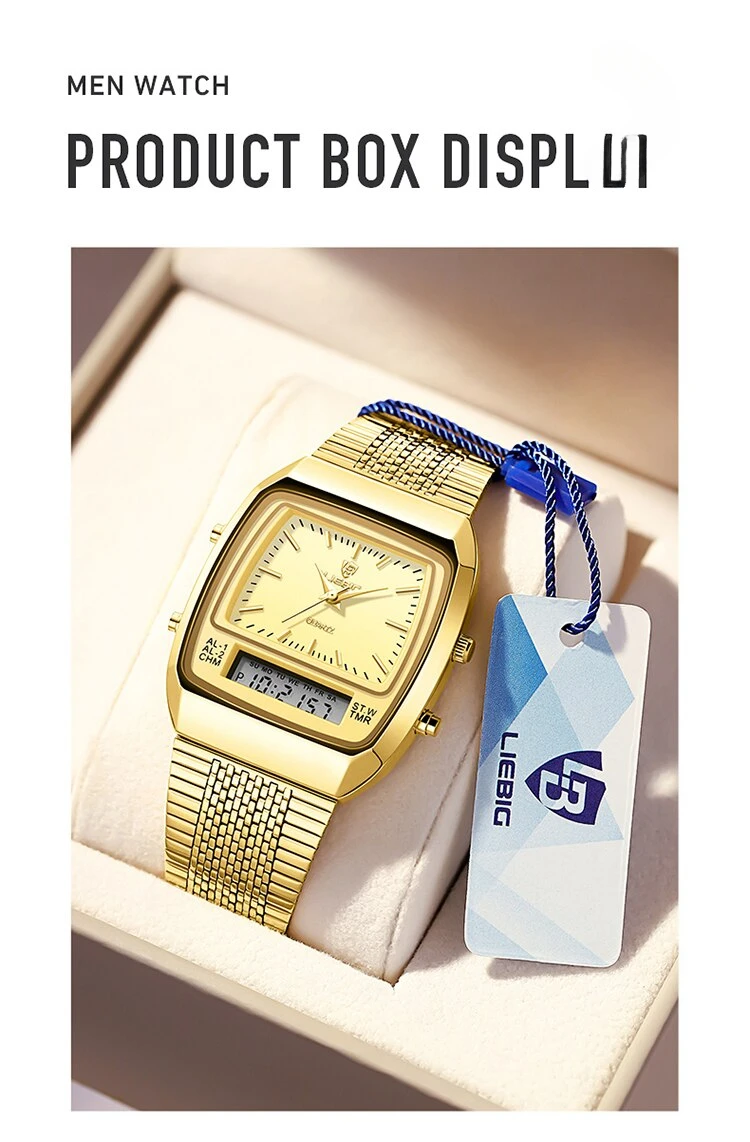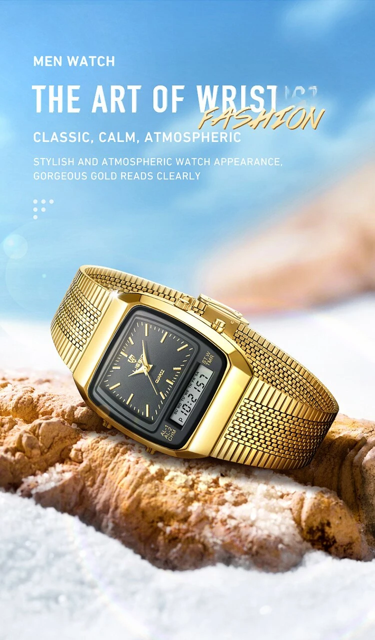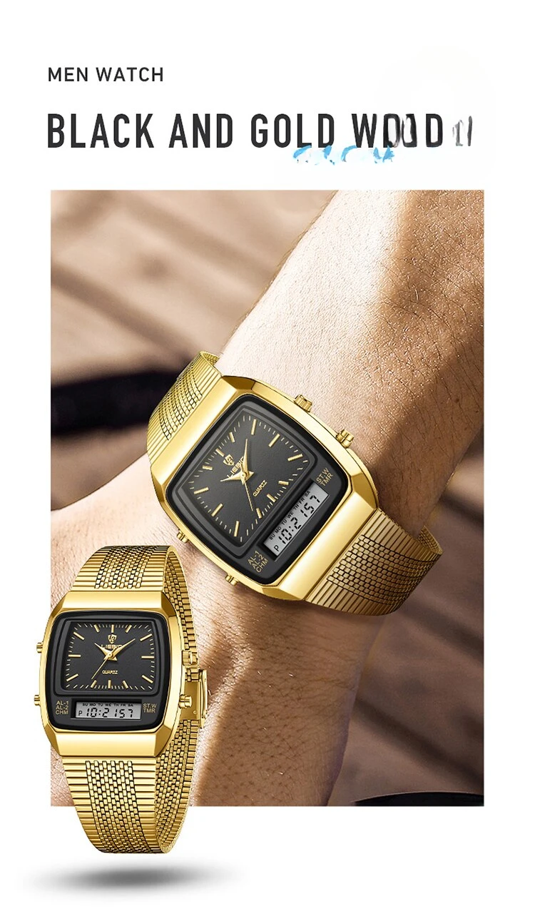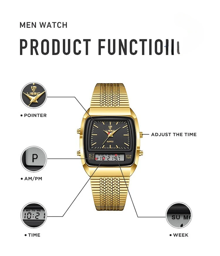 Colors: gold black▪Size:Men▪watch of Dial: barrel-shaped ▪ Water Resistance Depth: 30M▪ Functions: time,week,dual time.12/24 hours