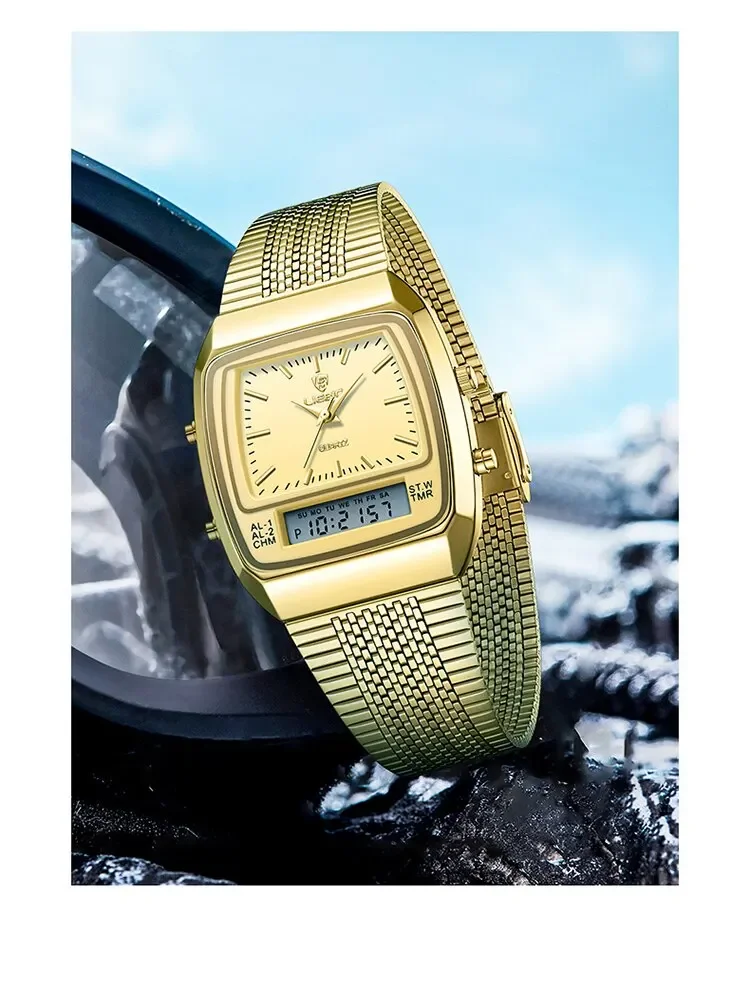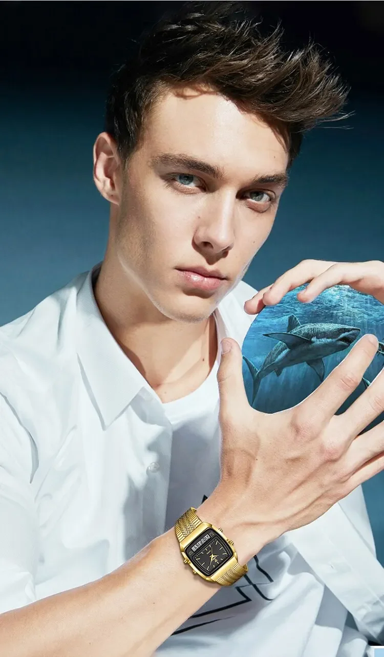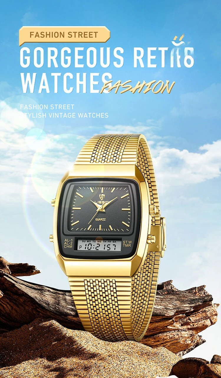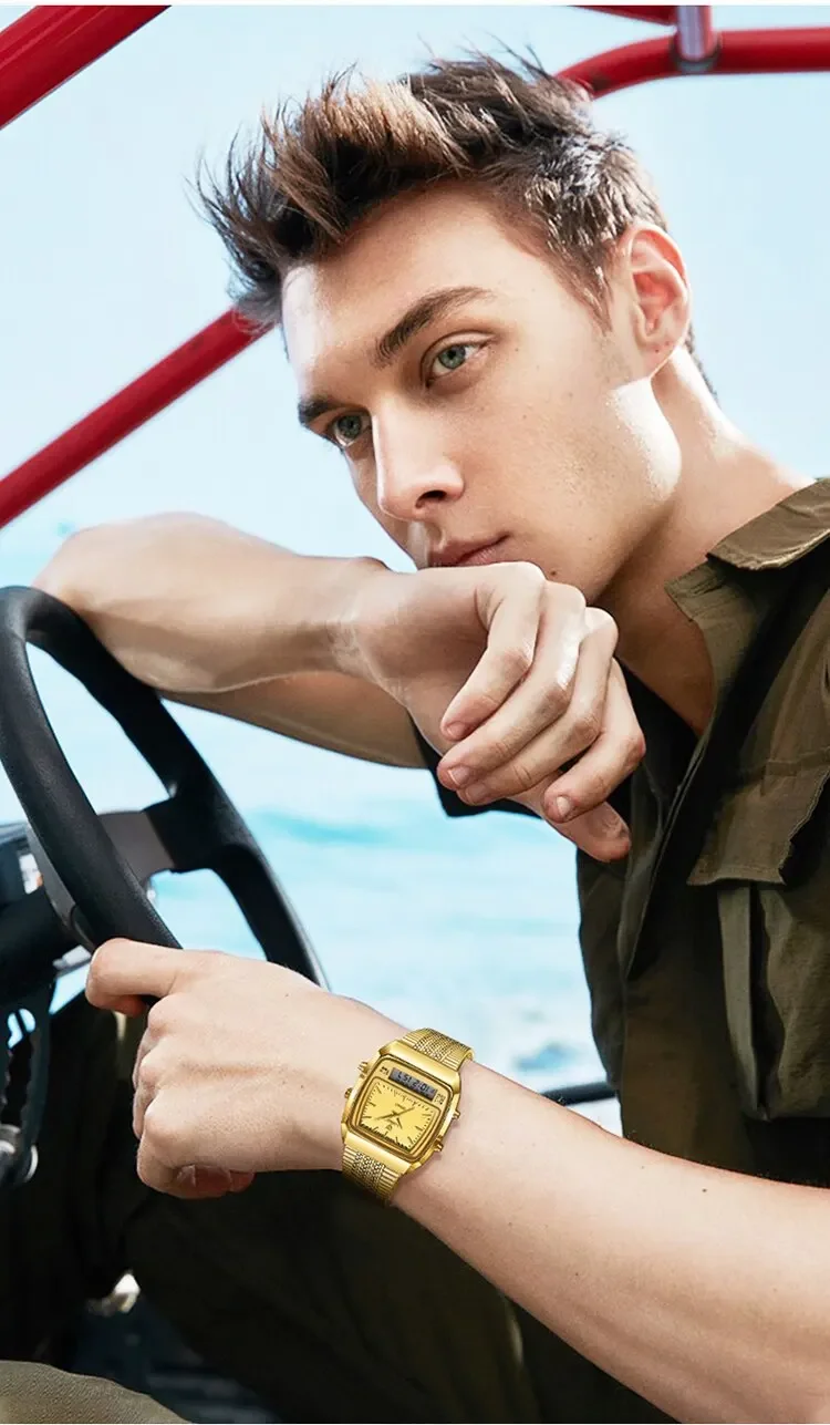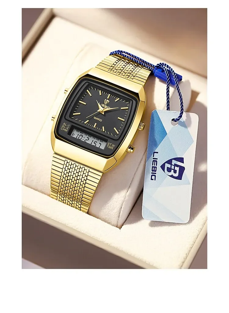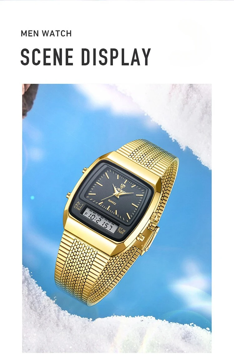 Colors: gold black▪Size:Men▪watch of Dial: barrel-shaped ▪ Water Resistance Depth: 30M▪ Functions: time,week,dual time.12/24 hours