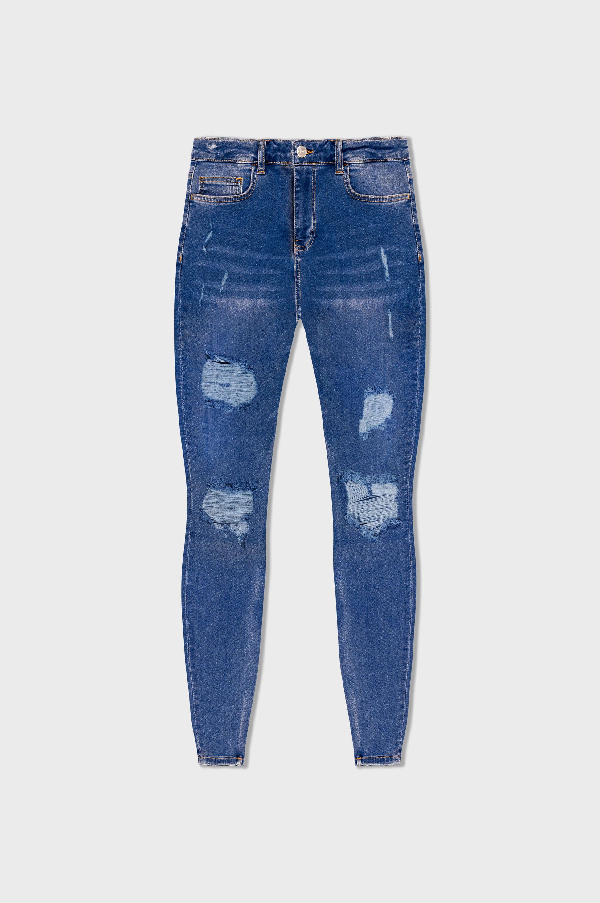 SKINNY FIT JEANS RIPPED AND REPAIRED - DARK BLUE